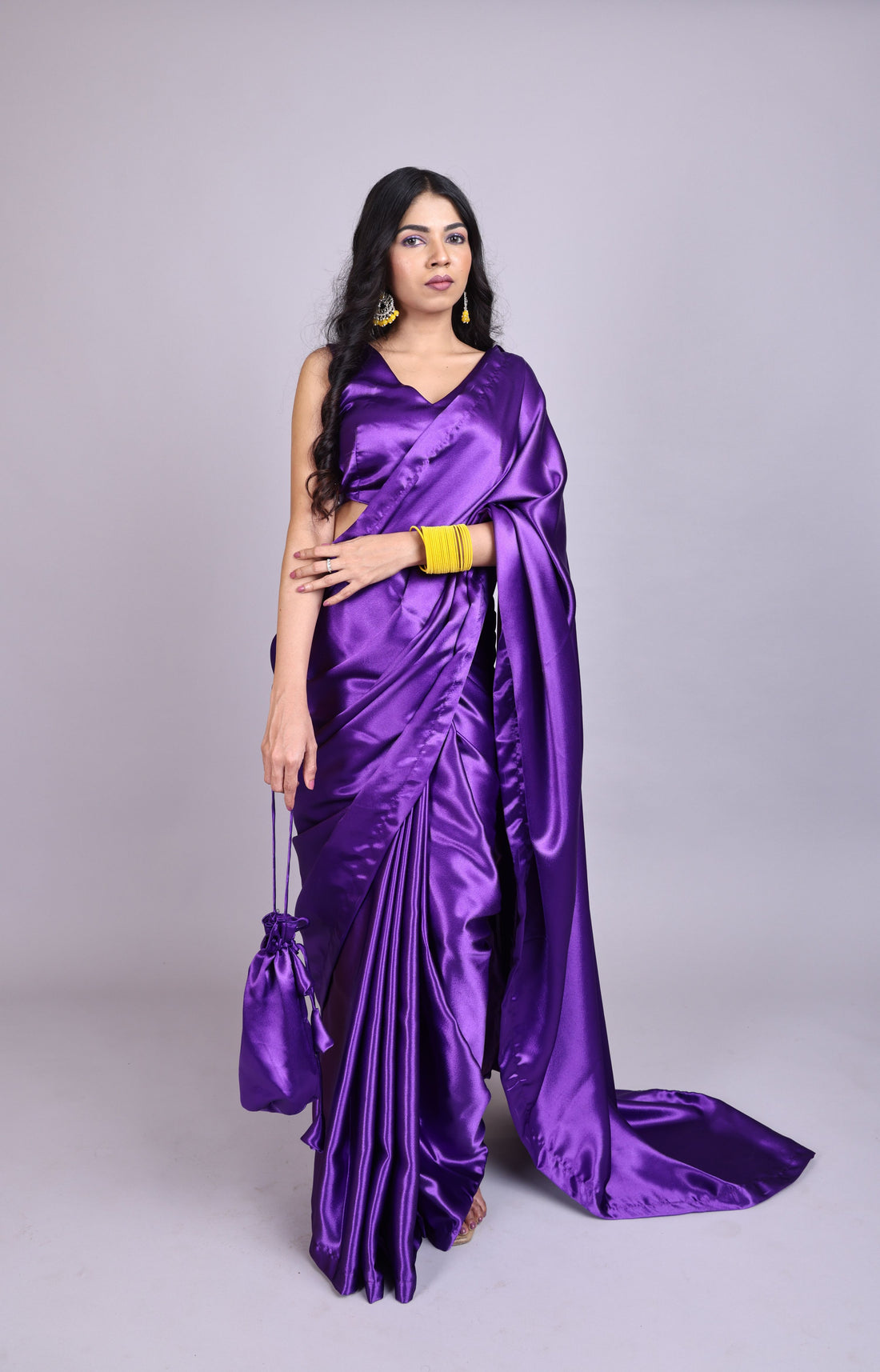 Purple Satin Shine Saree with Backless Tie-Up Blouse & Matching Potli Bag