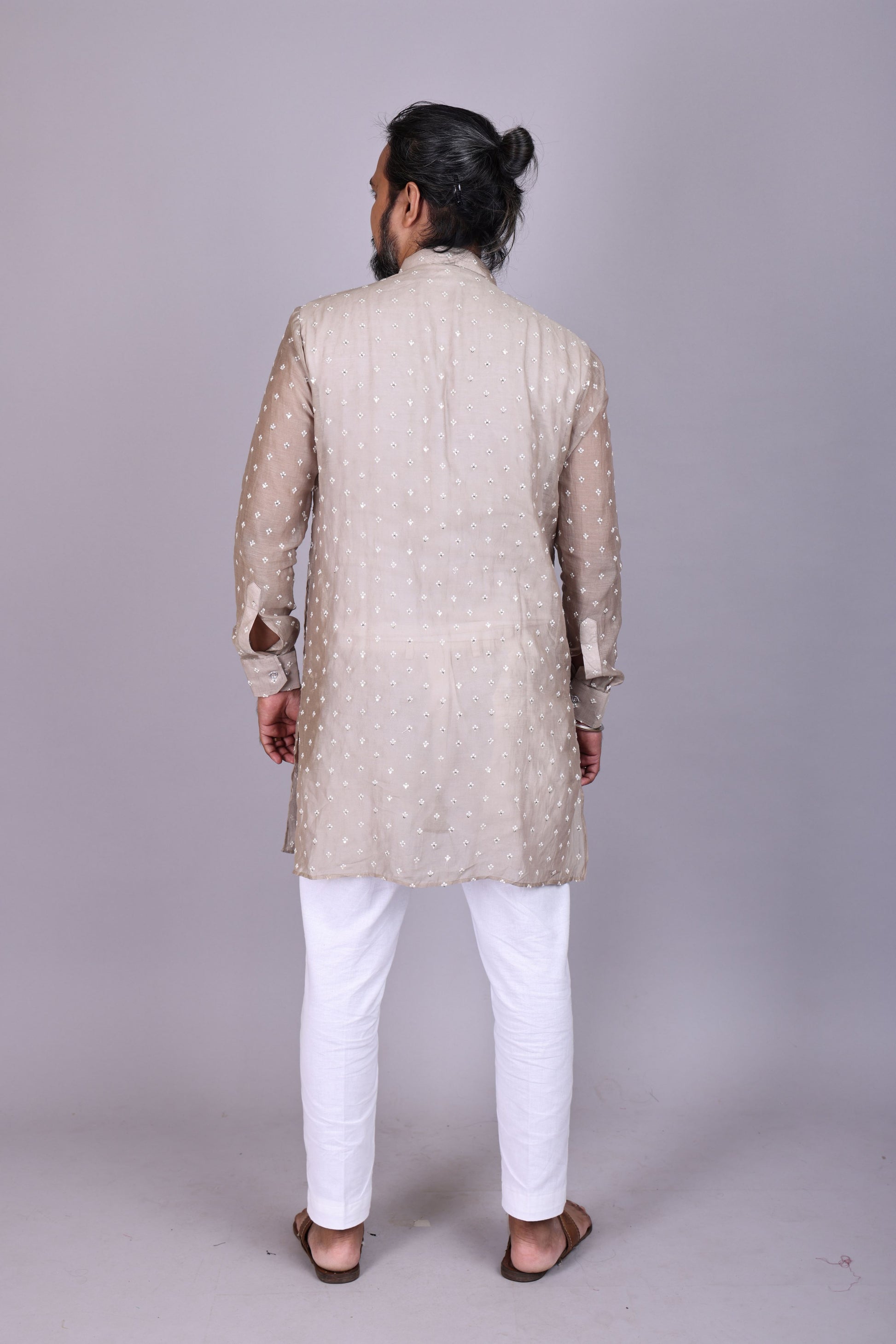 This graceful ensemble showcases a Chanderi kurta adorned with delicate embroidery that adds timeless sophistication. The soft beige hue combined with the sheer Chanderi texture creates a refined and elegant appeal.