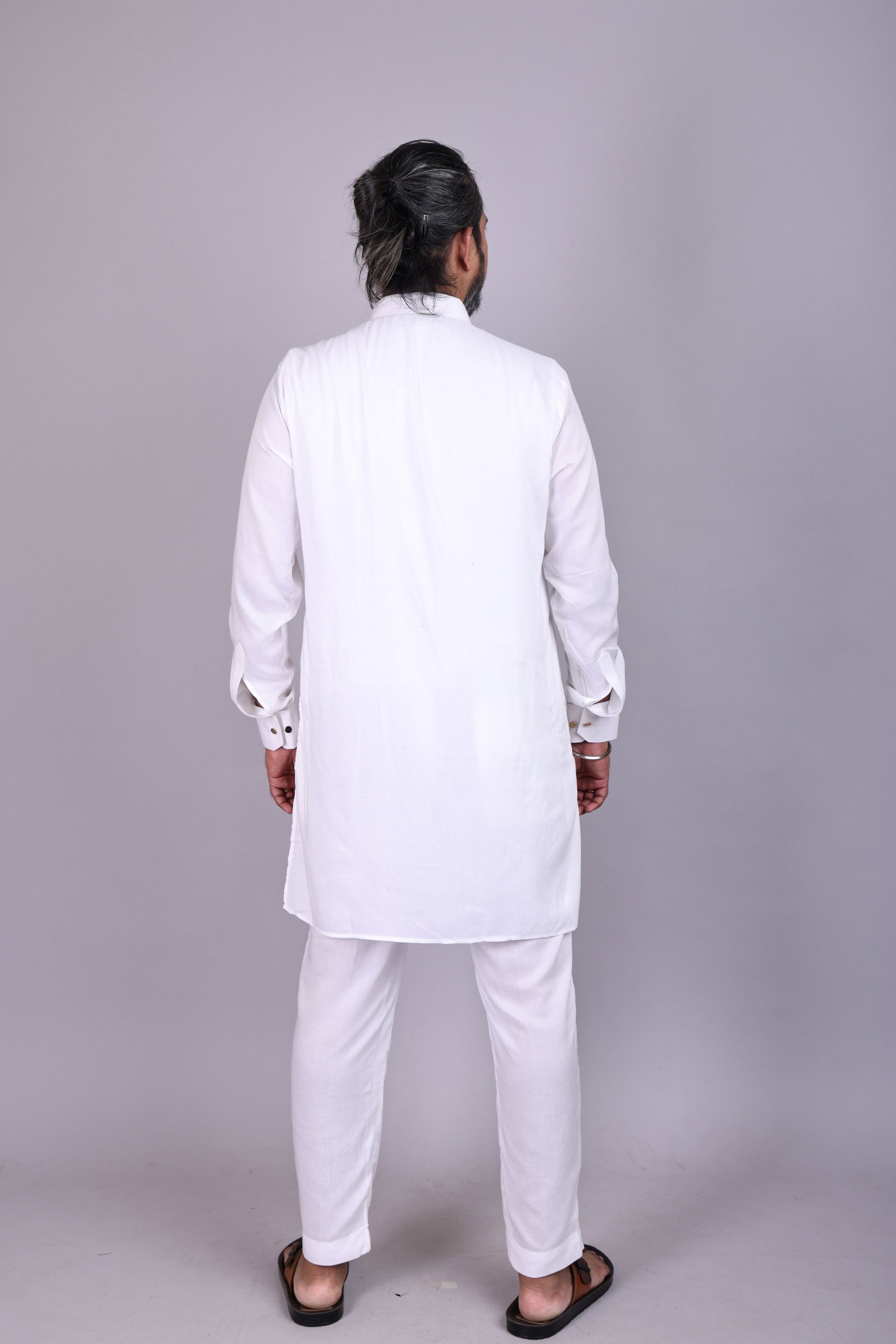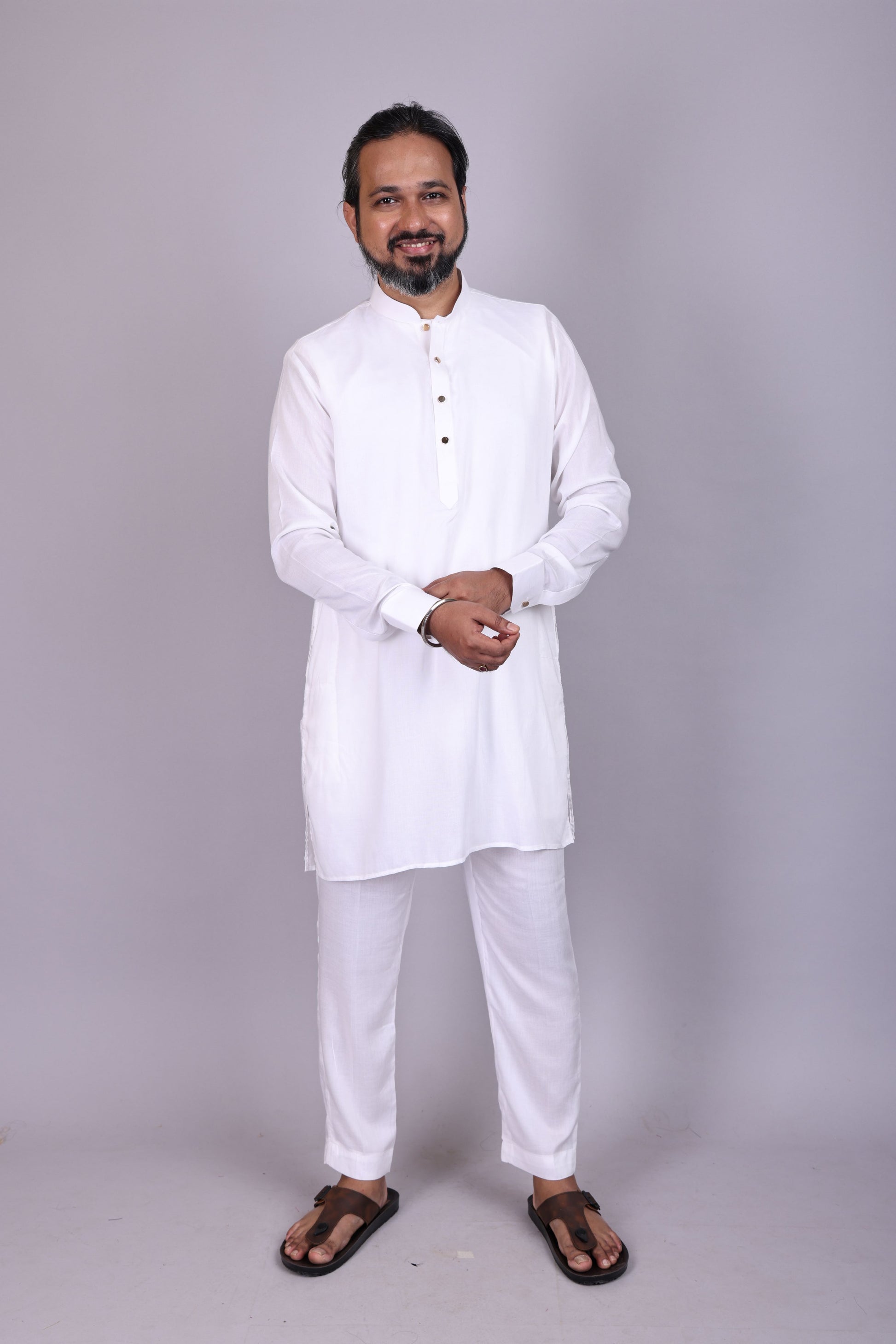 Elegant white kurta set crafted in modal fabric, offering a smooth texture and luxurious comfort. Lightweight, breathable, and perfect for festive or casual occasions.