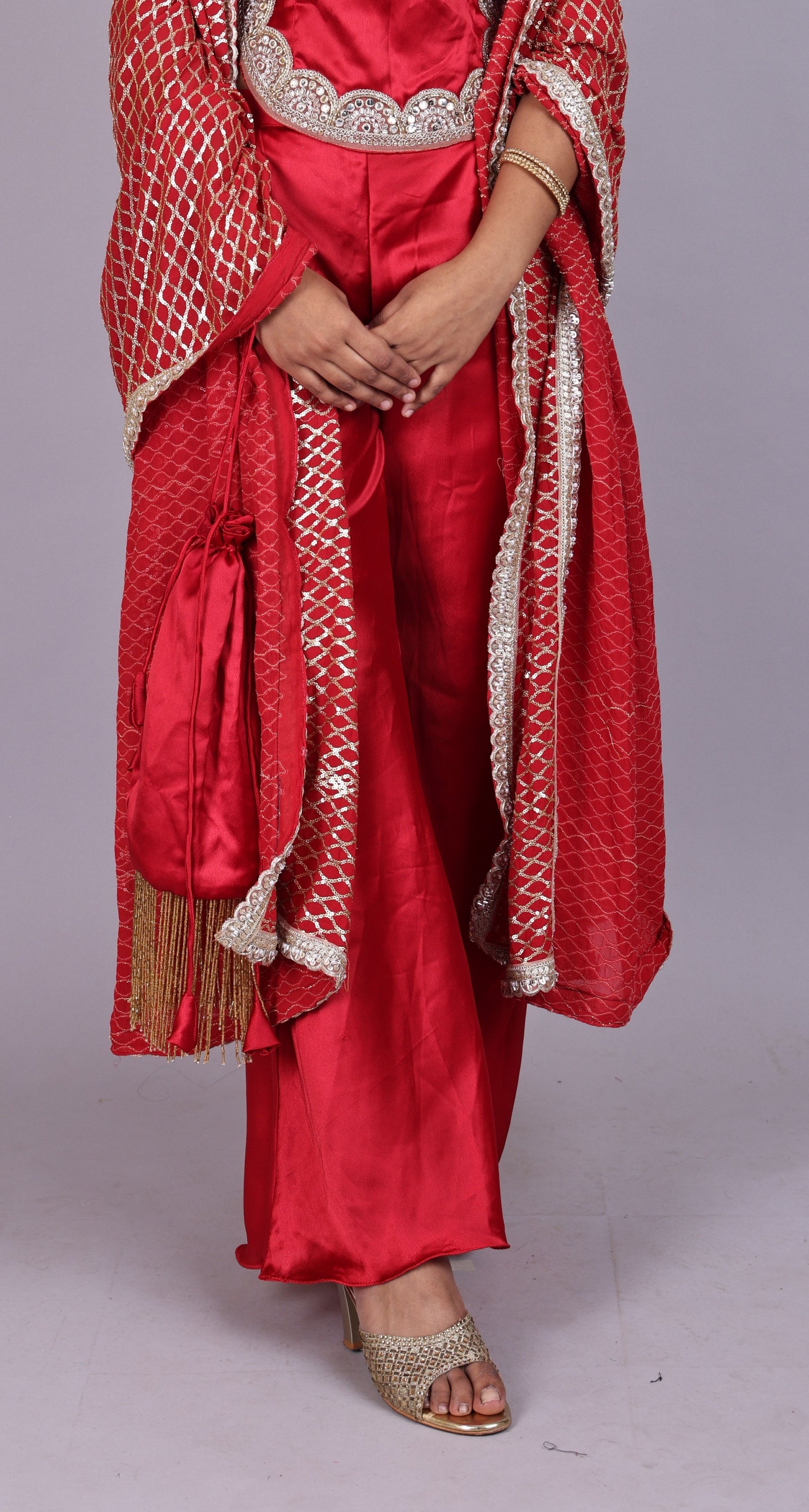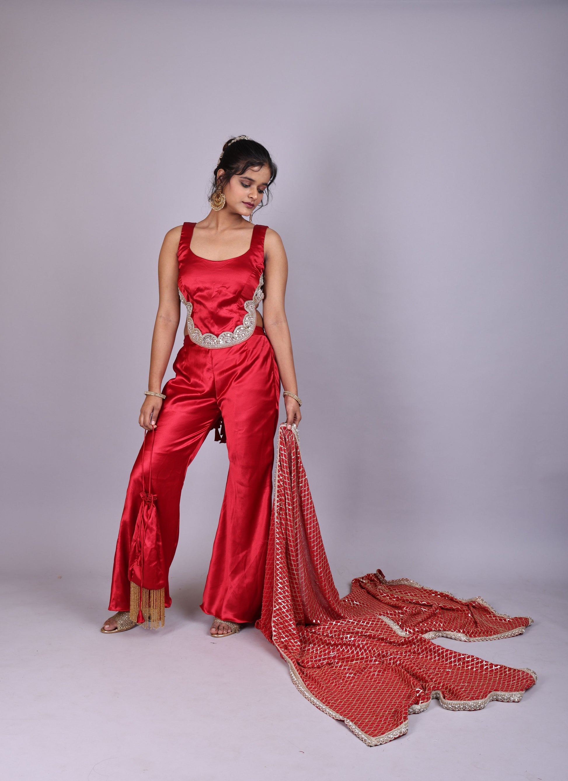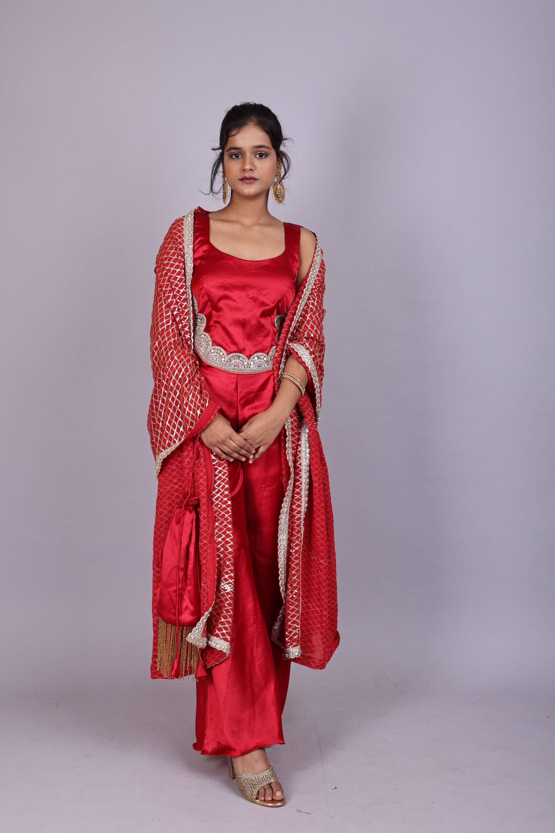 Red Satin blouse, plazo & dupatta set designed for effortless festive style and comfort.