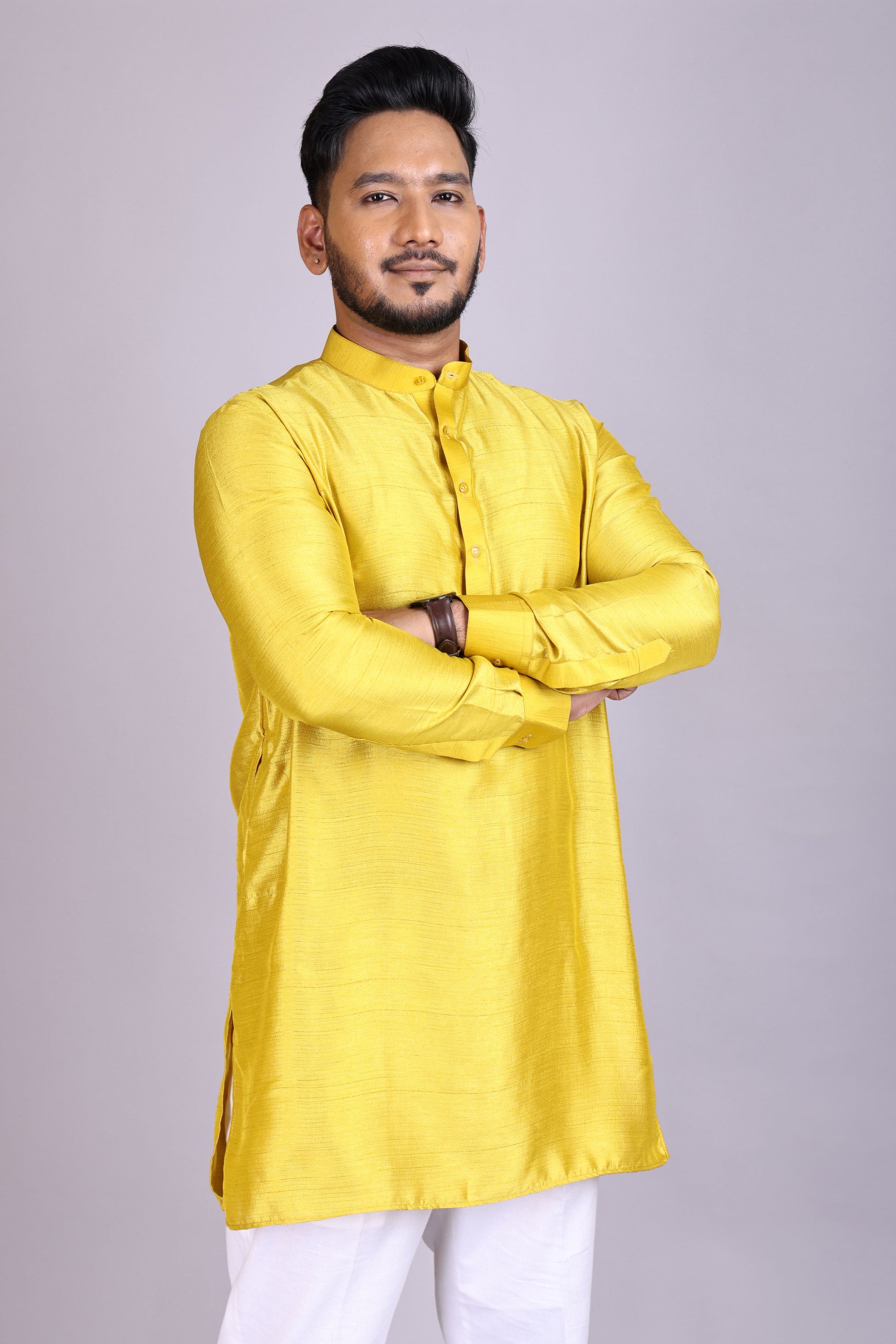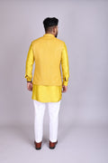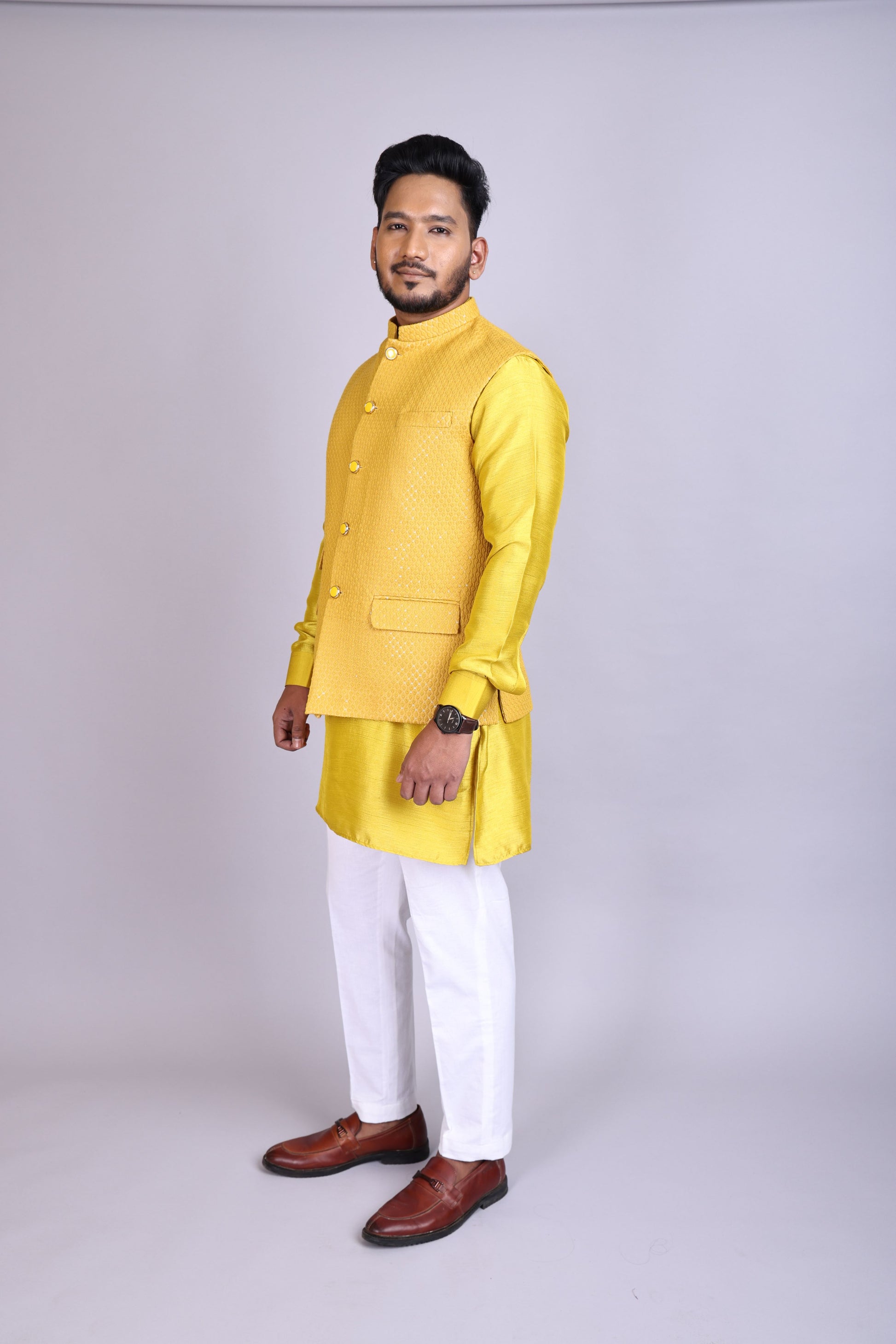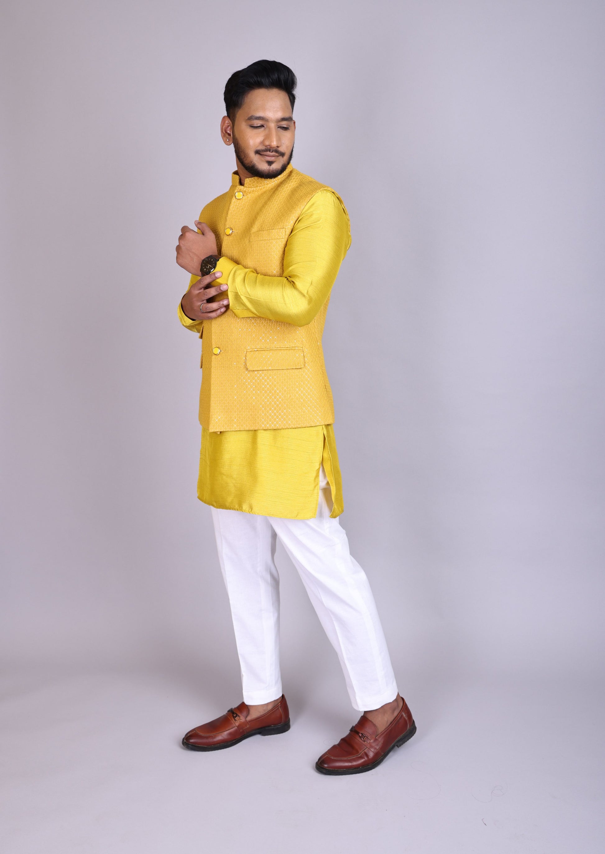 Silk kurta and Chikan kari designer Nehru jacket set. The luxurious golden silk kurta radiates elegance with its subtle sheen and smooth texture, while the intricately detailed Chikan kari Nehru jacket adds a layer of craftsmanship and sophistication.