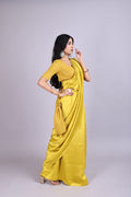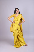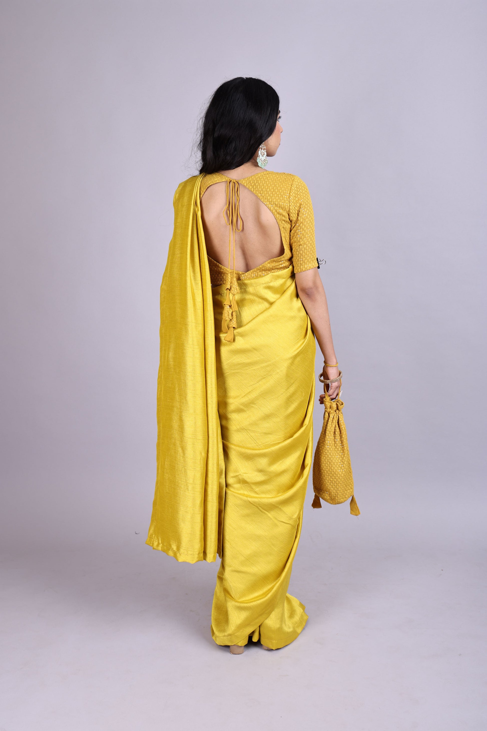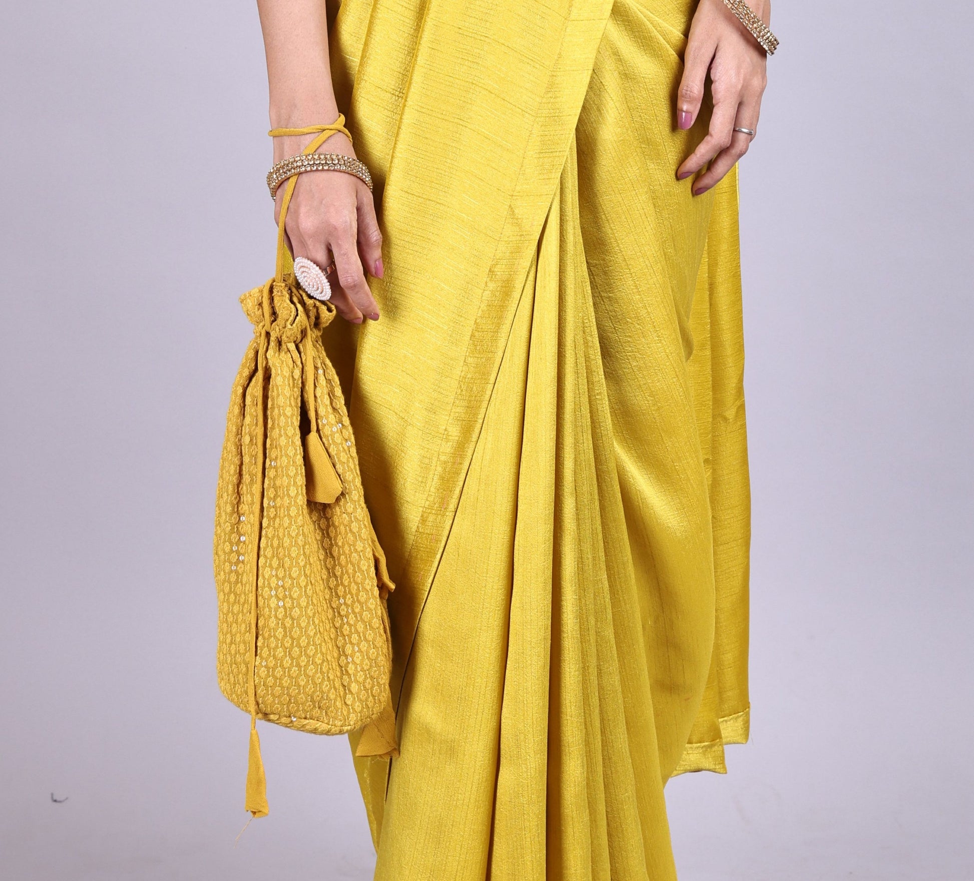 Mustard Yellow Silk Saree with Backless Chikankari Blouse & Matching Potli Bag