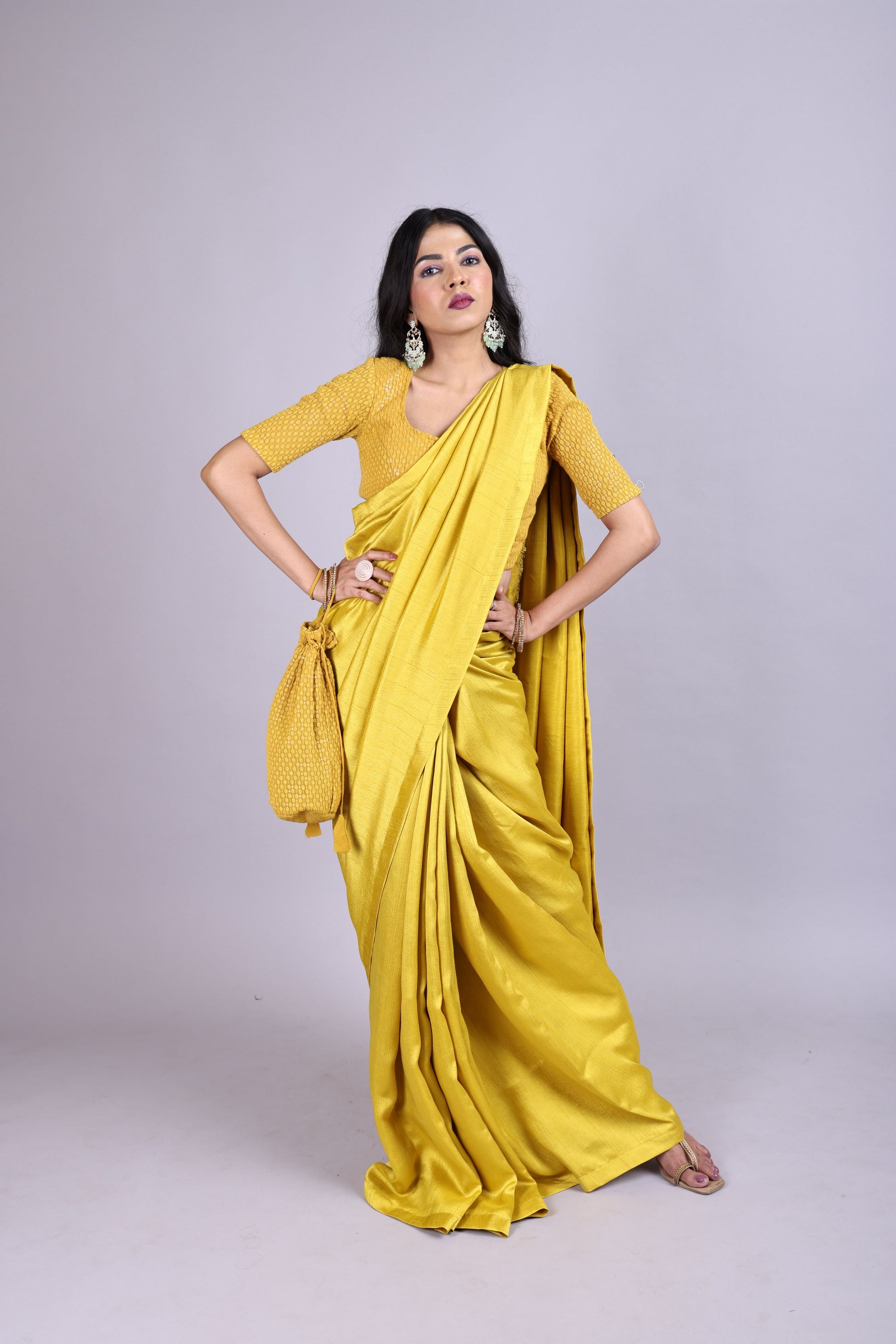 “Slay this festive season in our Mustard Yellow Silk Saree with a backless chikankari blouse and matching potli bag ,pure elegance meets festive charm!