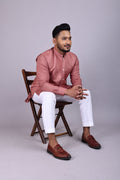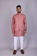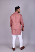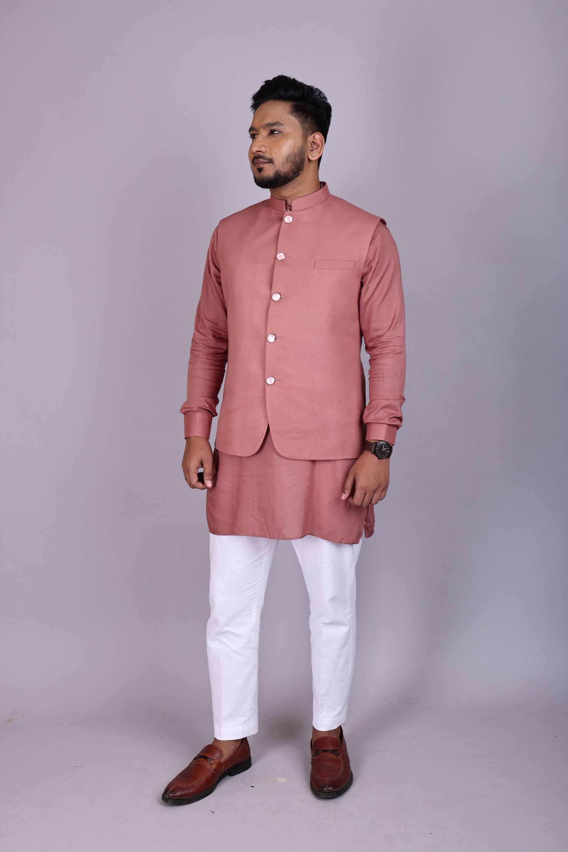 Elevate your ethnic look with this elegant Peach kurta set, paired with a matching Nehru jacket and white pants