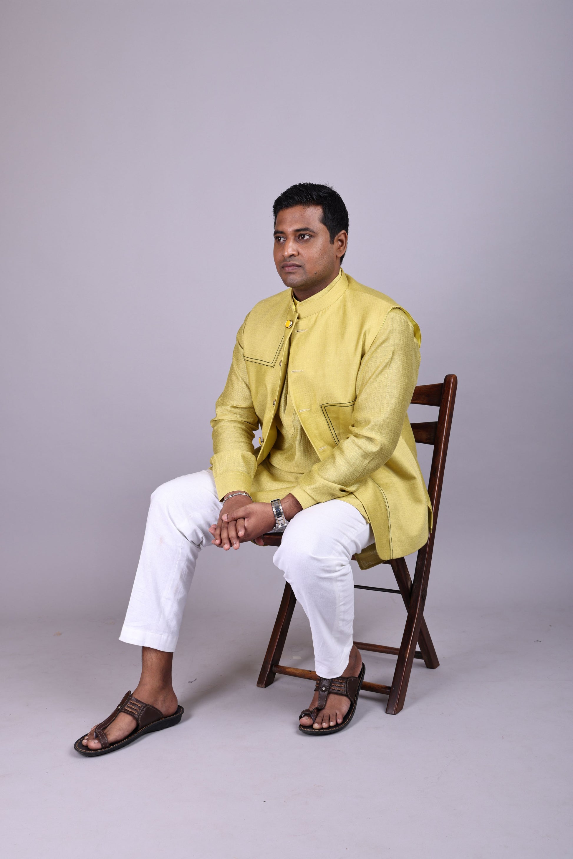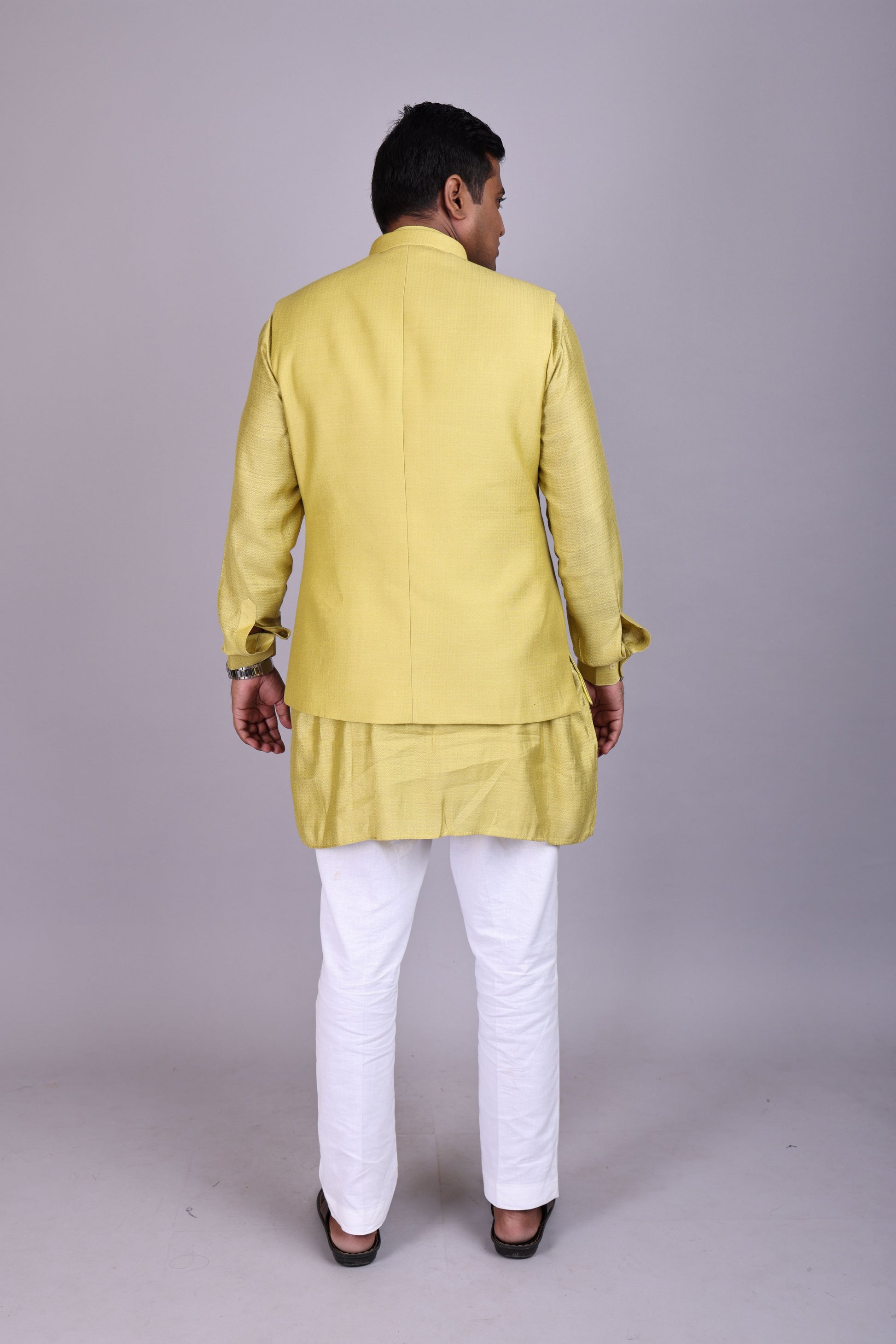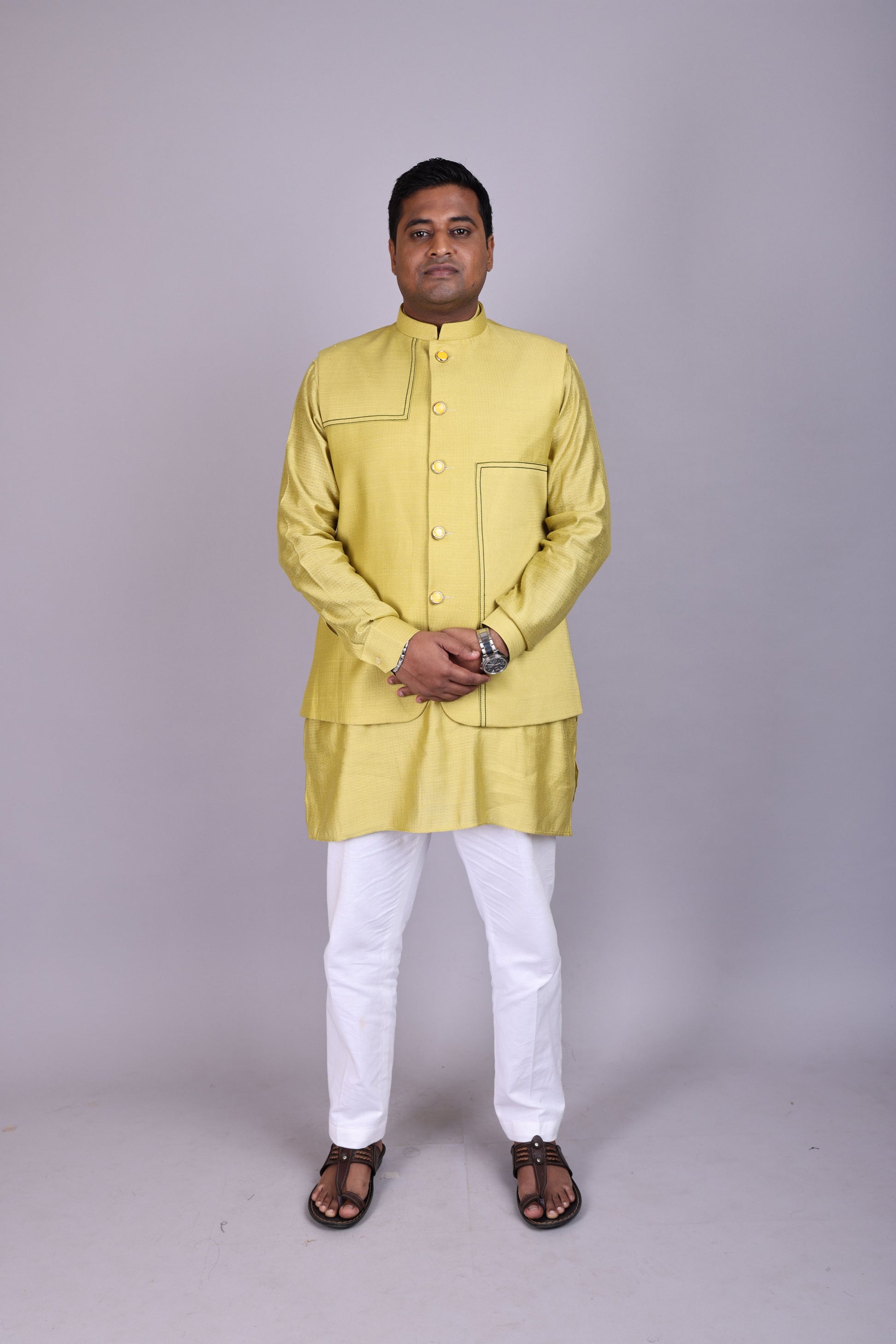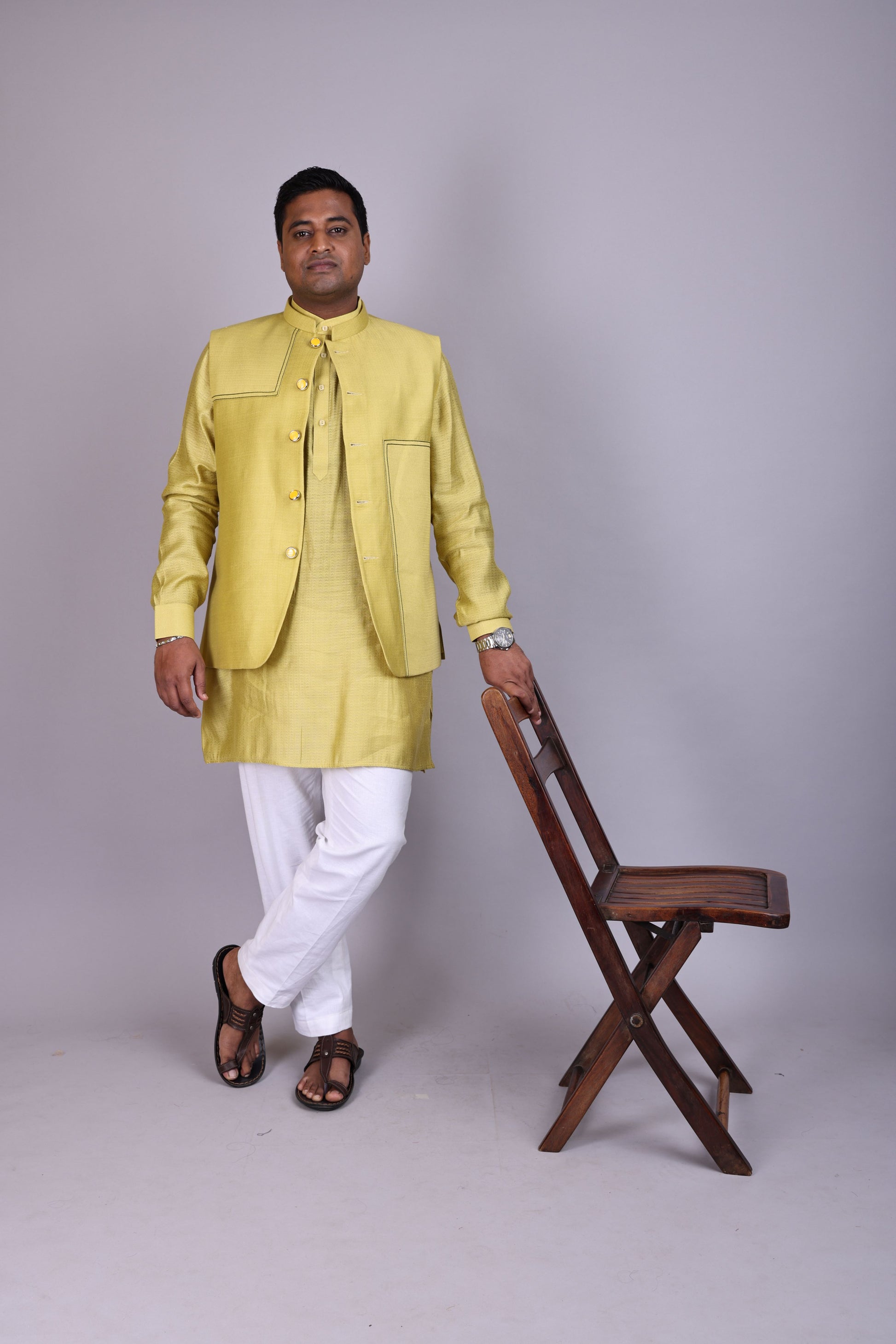 Lemon green silk-blend kurta set with contrast piping jacket and white pants. Perfect for festive or wedding wear — stylish, elegant, and comfortable.