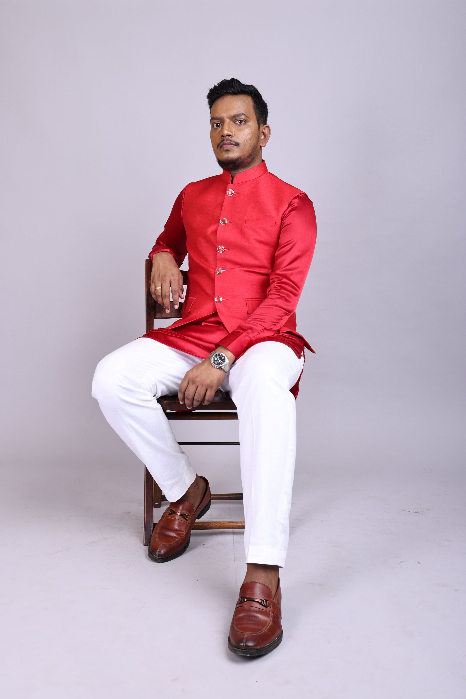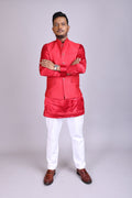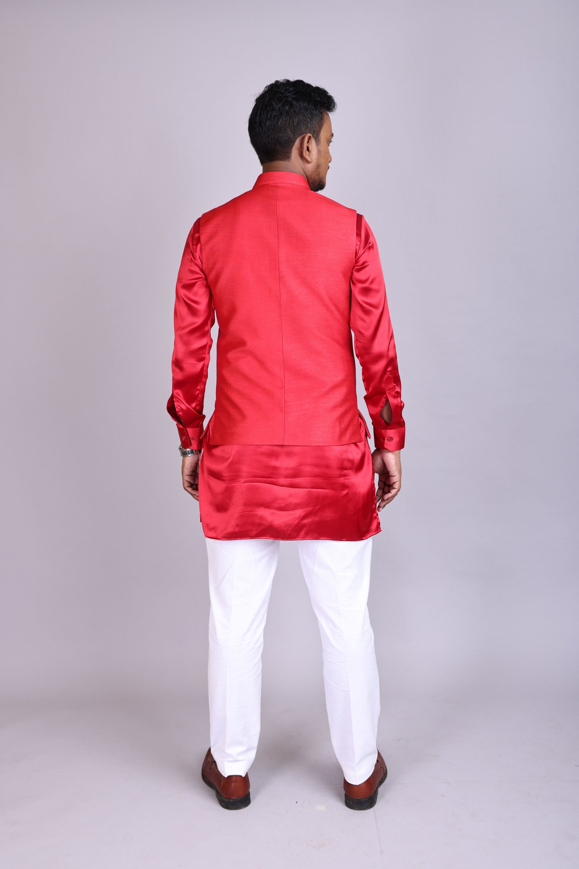 Stand out in this Red satin blend kurta with a matching Nehru jacket and white trousers. The gold buttons and rich satin finish add a festive touch—perfect for weddings or celebrations.