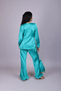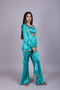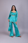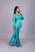 Chic teal satin-silk co-ord set featuring an embellished tunic with inner blouse, flared pants, and a matching potli bag. Perfect for weddings, parties, and festive occasions.