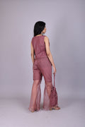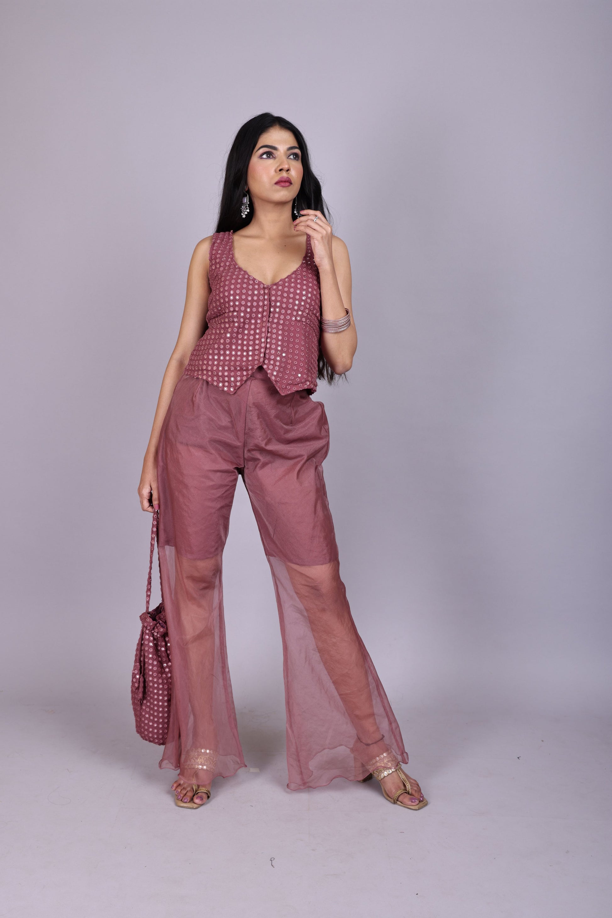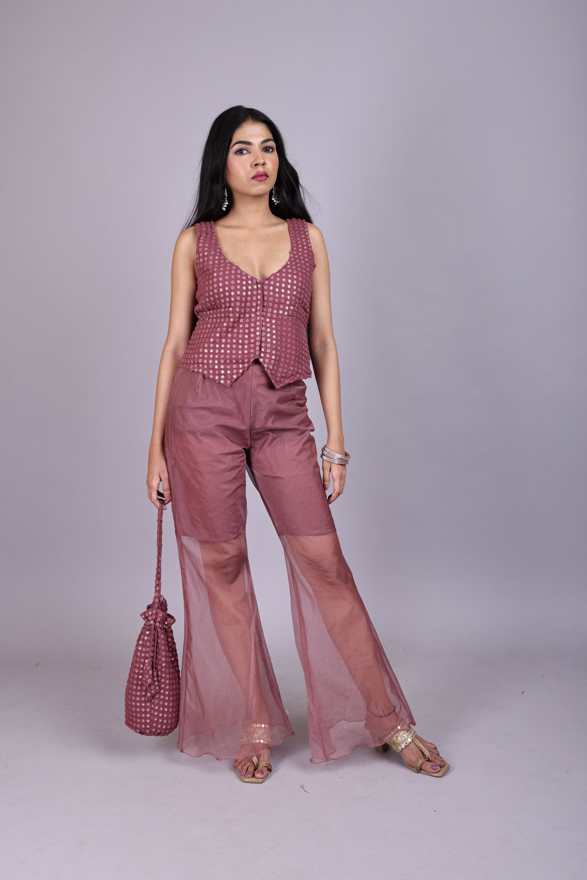 Stylish wine sheer co-ord set with an embellished blouse, flowy wide-leg pants, and a matching potli bag ,perfect for weddings, festive occasions, and parties.