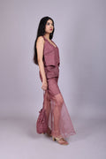 Wine Sheer Co-ord Set with Embellished Blouse & Potli Bag